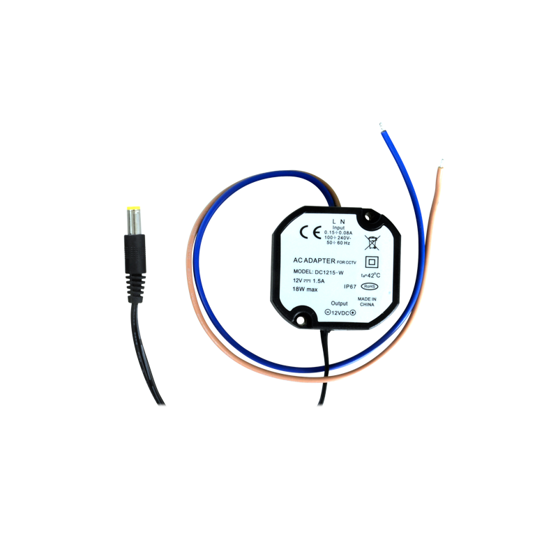 Alimentatore - Ingresso 100-240 V 50/60 HZ 0.5 A - Uscita 12 V 1.5 A - Dimensioni testa 46 (Al) x 46 (An) x 25 (Fo) mm - Adatto per esterni, IP67