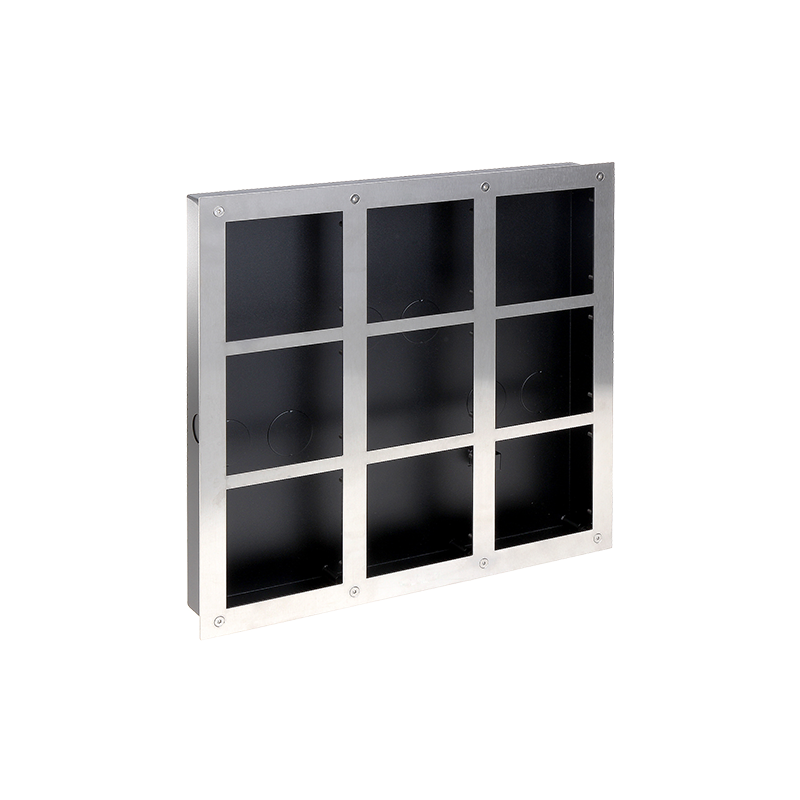 X-Security - Scatola di giunzione per videocitofono modulare XS-V2000E-M(X) - Capacità 9 moduli (3x3) - Misure cassa: 390mm (Al) x 367mm (An) x 50mm (Fo) - Misure pannello 391mm (Al) x 369mm (An) x 10mm (Fo) - Realizzato in acciaio - Collegamento versatile con fori di collegamento - Include pannello frontale di acero inossidabile