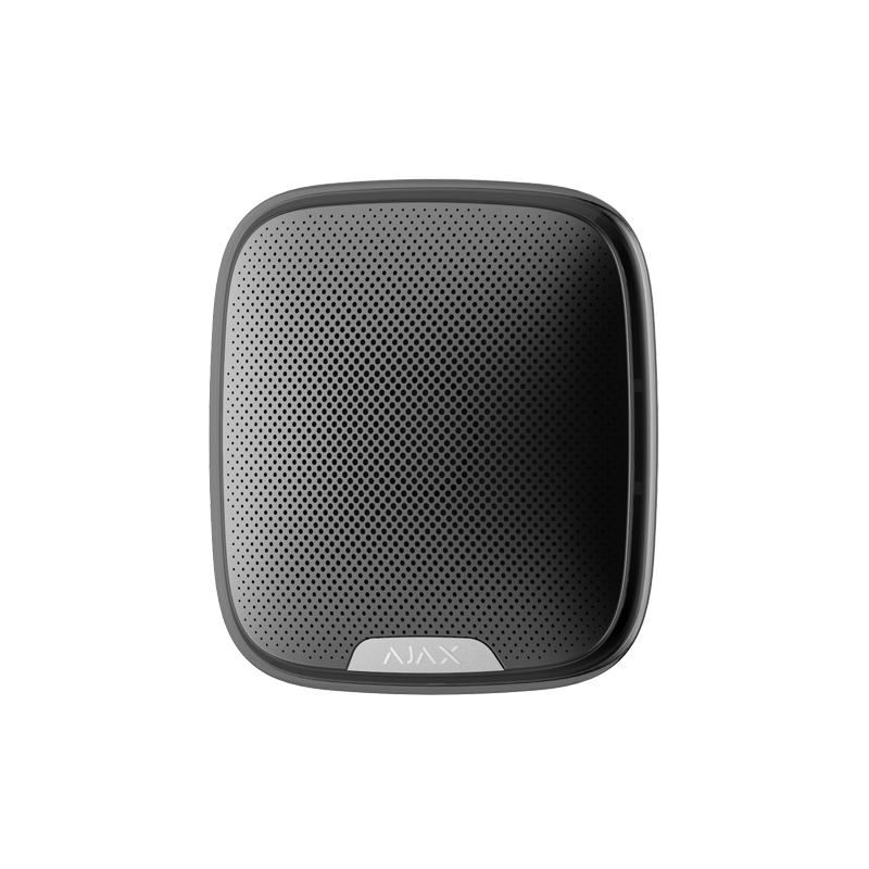 Ajax - Sirena per esterni - Certificato grado 2 - Bidirezionale - Senza fili 868 MHz Jeweller - Antenna interna distanzi spazi aperti 2000 m - 85~113 dB a 1 m di distanza - Durata massima del suono 3 minuti - Luce di avviso allarme e armato / disarmato - Alimentazione 4 pile CR123A 3.0 V (durata stimata 5 anni) o fonte esterna 12V DC - Per esterni - Comprende supporto - Colore nero