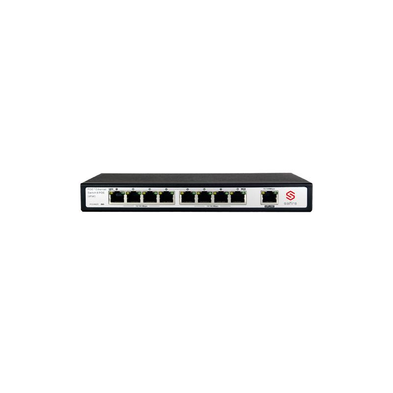 Safire - Switch da tavolo - 8 porte + 1 Uplink RJ45 10/100 Mbps - 8 porte PoE - Supporta alimentazione PoE fino a 120W in totale per tutte le porte - Compatibile con PoE IEEE802.3af/at - Modo CCTV che aumenta la distanza a 250m per 10 Mbps